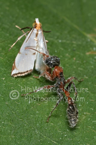 Covered in scales from the moth, this ant was scurrying around a leaf not sure what to do with his big catch.