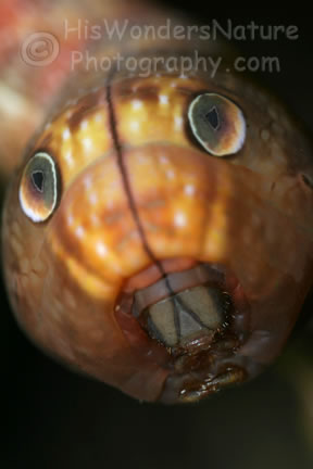 Don't let those big eye spots fool you. The tiny eyes of this hungry caterpillar are on the tiny head tucked inside because of the disturbance.