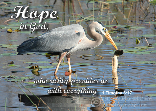 Have you ever wondered how you were going to pay that bill? or get the car fixed? or finish that project? Where is the money or strength going to come from? God. He provides when you least expect it and provides an abundance. This Great Blue Heron doesn't worry about his next meal, he just stands and waits, and God provides a great big fish.